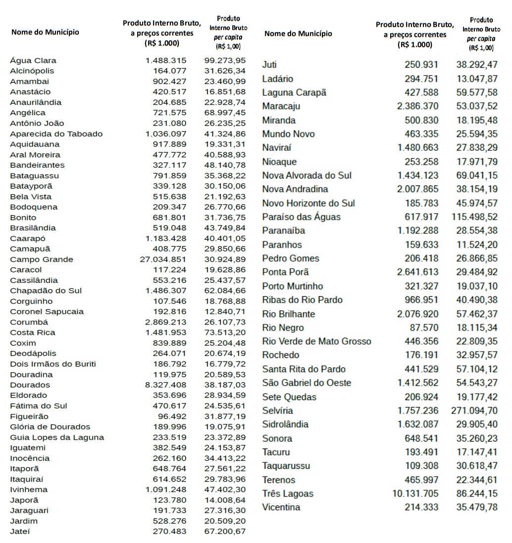 O município no topo da lista é Paulínia (SP), com PIB per capita de R$ 344,8 milhões e população estimada, em 2017, de 102.499 habitantes. Paraíso das Águas aparece em 36º lugar, com PIB per capita de R$ 115,4 milhões; Água Clara ocupa o 59º lugar, com R$ 99,2 milhões; e Três Lagoas em 83º lugar, com R$ 86,2 milhões.