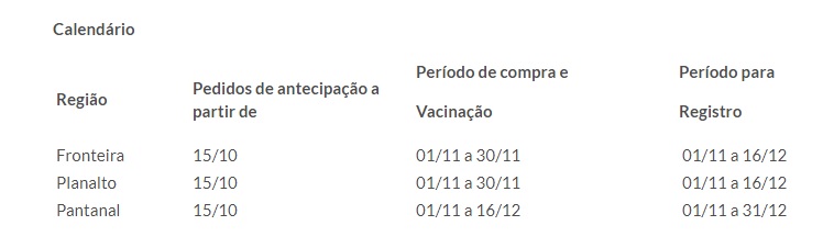 Para as regiões do Planalto e Fronteira o período de compra e vacinação estarão abertos de 1º a 30 de novembro, e o de registro vai até 16 de dezembro.