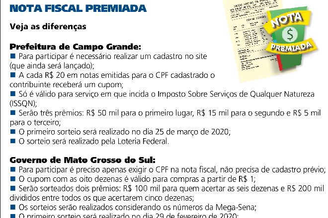 O sorteio será realizado mensalmente pela loteria federal. A cada R$ 20 em compras, gera um cupom que irá concorrer ao sorteio. O primeiro sorteio será no dia 25 de março. Para participar, o consumidor deve acessar a página do Nota Premiada Campo Grande na internet e se cadastrar.