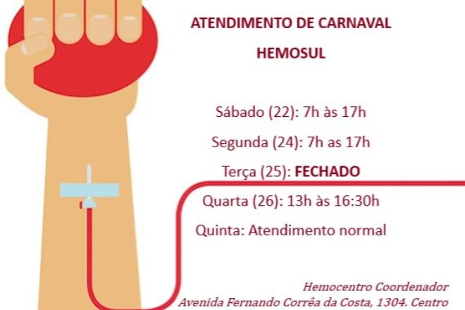 Pensando nisso, o Hemosul divulgou cronograma de horários para atendimento durante o feriado de carnaval.