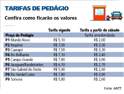 A Agência Nacional de Transporte Terrestre (ANTT) decidiu que a partir da zero hora do próximo sábado (dia 30) os usuários da BR-163 vão pagar em média 53,94% a menos na tarifa de pedágio cobrada nas nove praças. A decisão foi tomada pela Diretoria Colegiada da autarquia, com a inclusão do processo envolvendo a Concessionária CCR MSVia como extra pauta. A redução no preço do pedágio era para ter ocorrido na primeira quinzena de setembro, período de revisão tarifária.