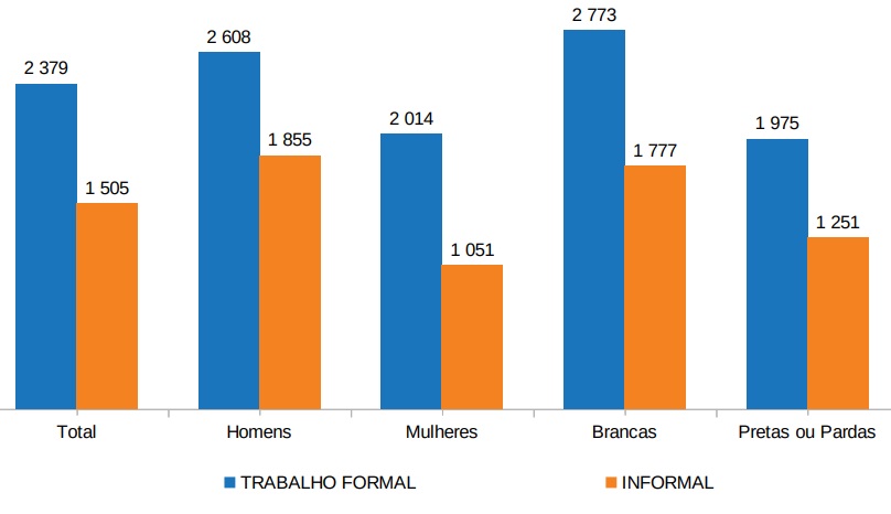 Em 2018, o rendimento médio dos trabalhos formais era de R$ 2,5 mil e o dos trabalhos informais era de R$ 1,5 mil, apresentando diferença de R$ 941. Porém, a divergência maior de rendimento foi registrada entre pessoas brancas. No trabalho formal, era de R$ 2,9 mil, contra R$1,9 mil no trabalho informal.